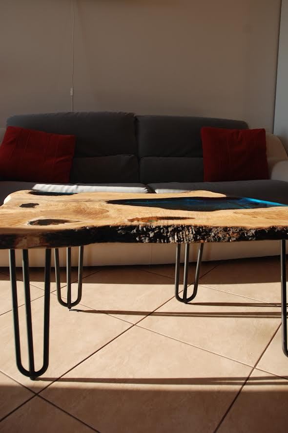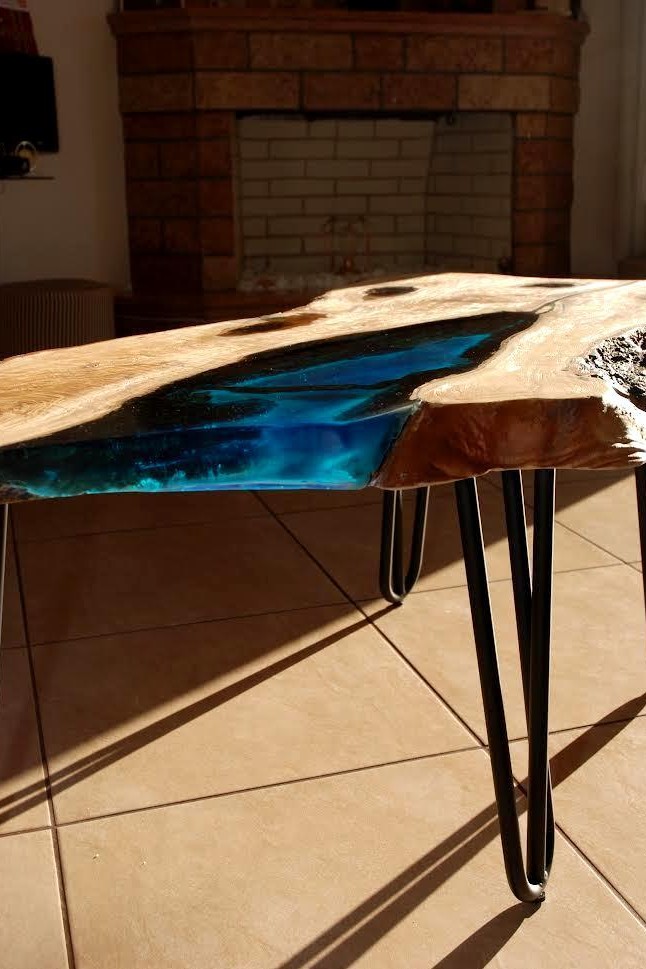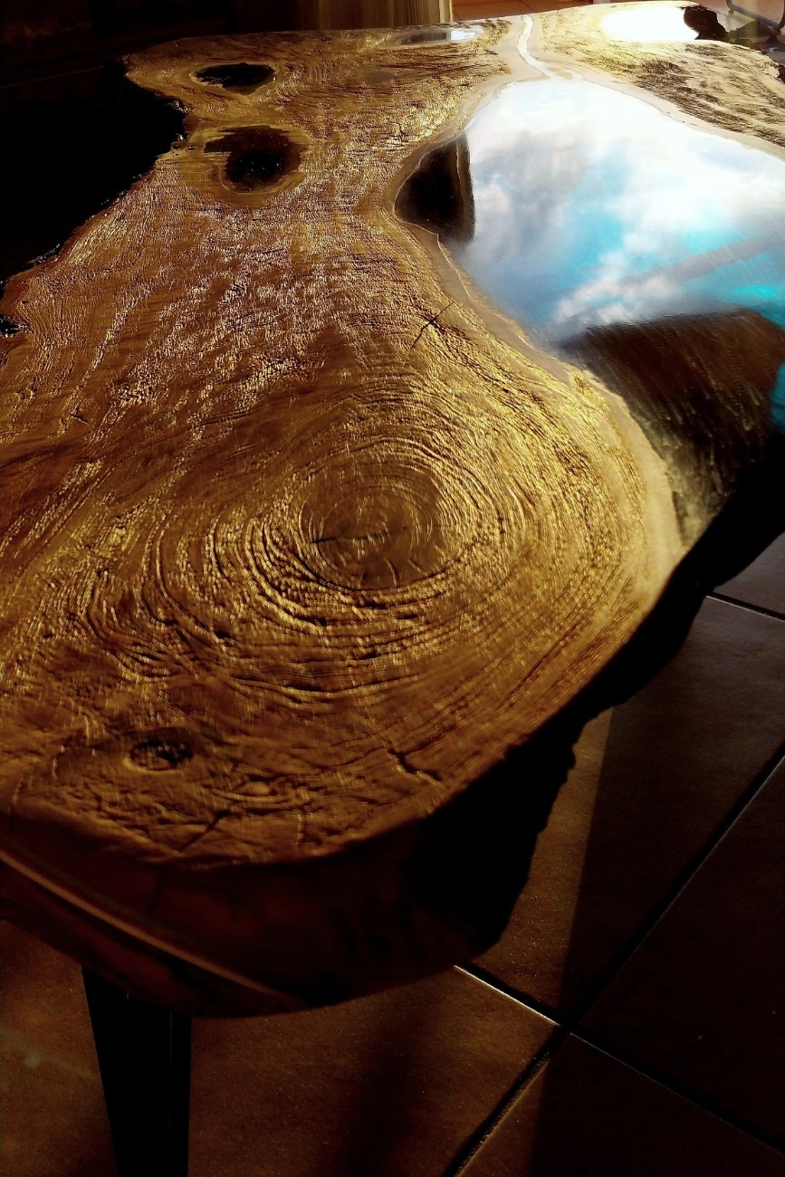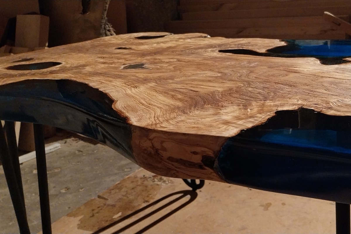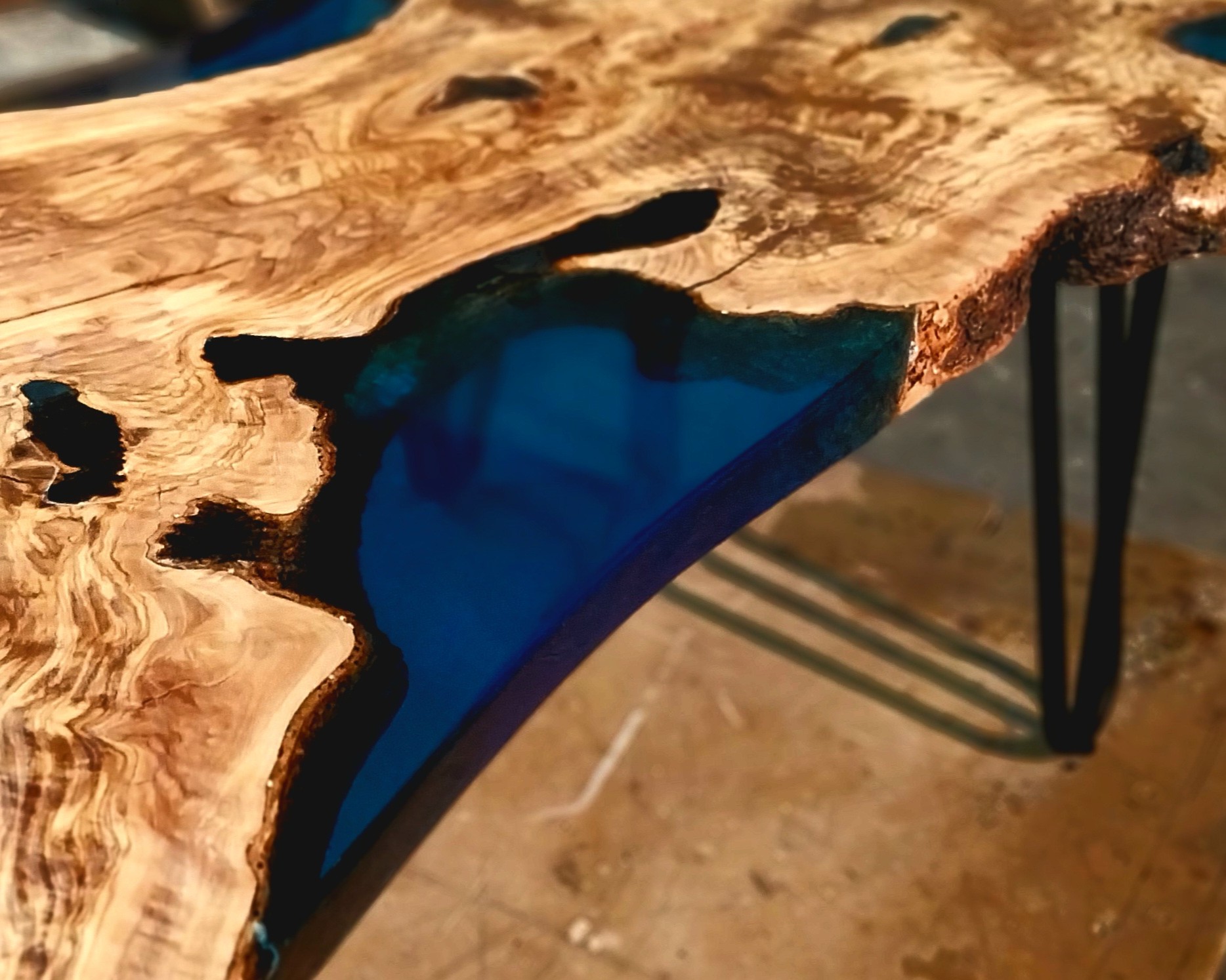 Ο ανάγλυφος κορμός της ελιάς, φινιρισμένος σε φυσική ματ απόχρωση, συνδυάζεται αρμονικά με μπλε υγρό γυαλί, αναδεικνύοντας τα νερά και τη φυσική υφή του ξύλου. Κάθε τραπέζι είναι μοναδικό έργο τέχνης, με την τιμή να διαμορφώνεται ανάλογα με τον χρόνο κατεργασίας και την ποσότητα εποξικής ρητίνης.